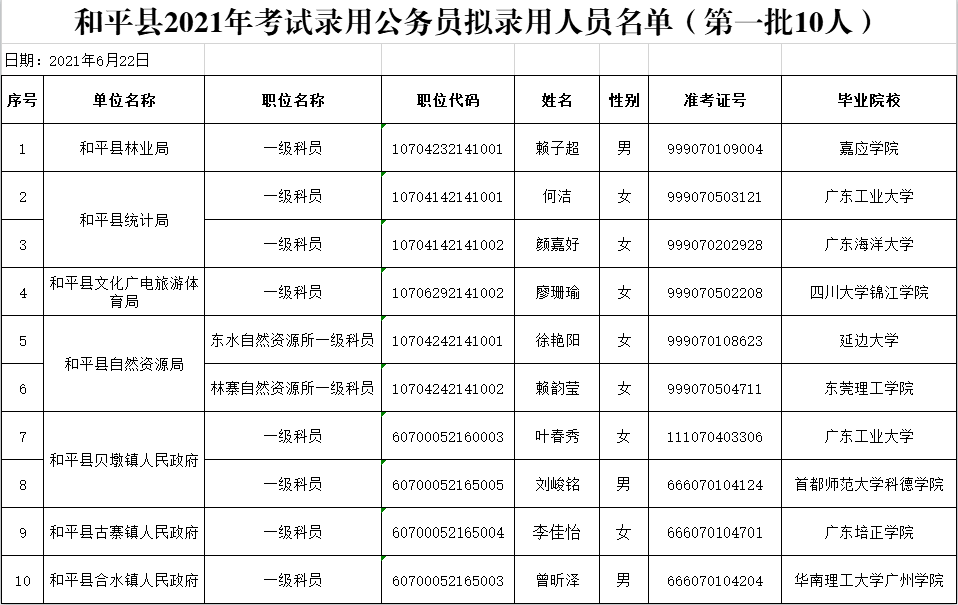 附件:和平县2021年考试录用公务员拟录用人员名单(第一批10人)